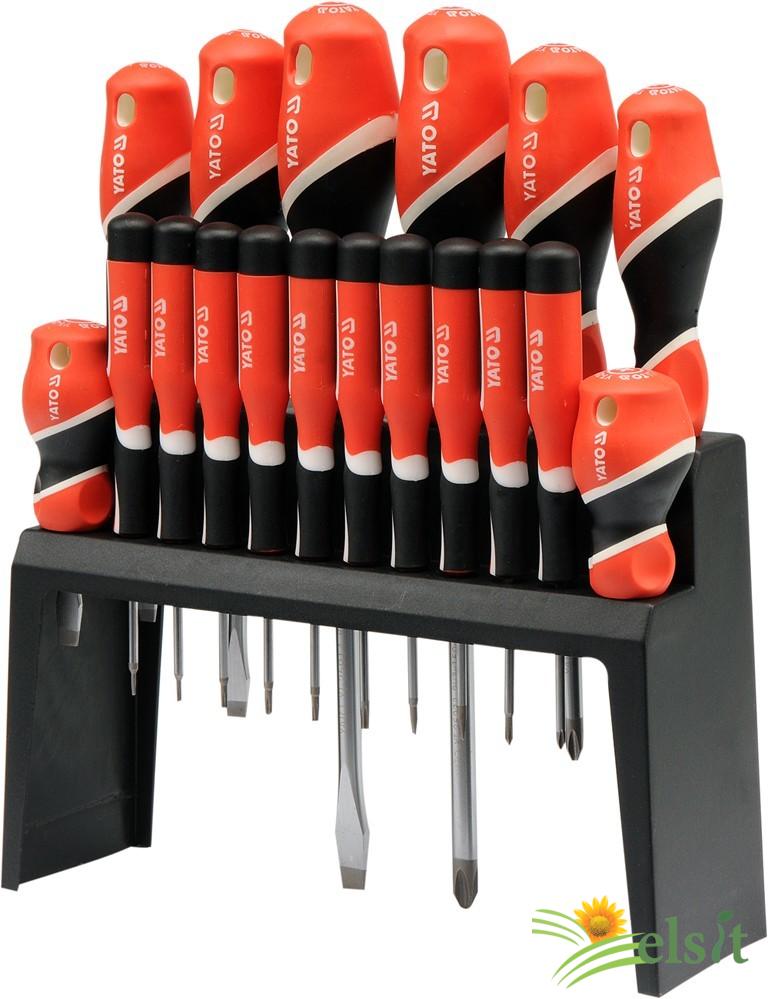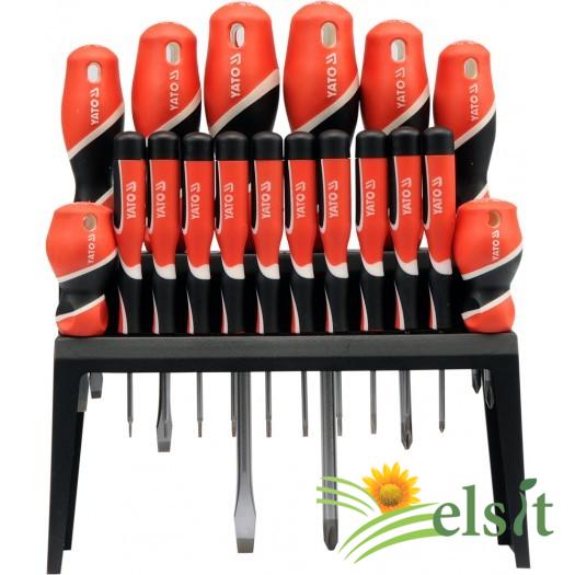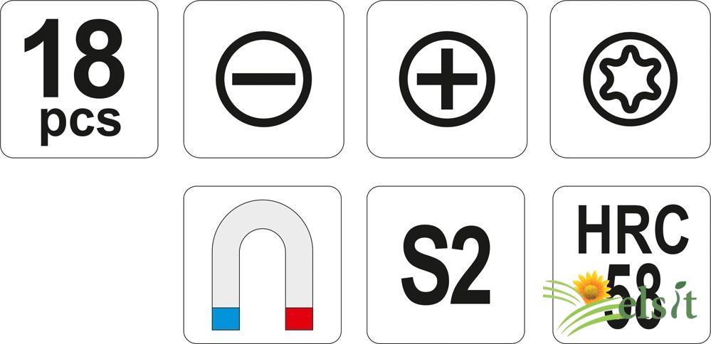 Set de 18 surubelnite fabricate din otel cu simbol S2 cu o duritate de aproximativ 58HRC. Tija surubelnitei este satinată, iar vârful de lucru este întărit și șlefuit, conferind o mai mare stabilitate.