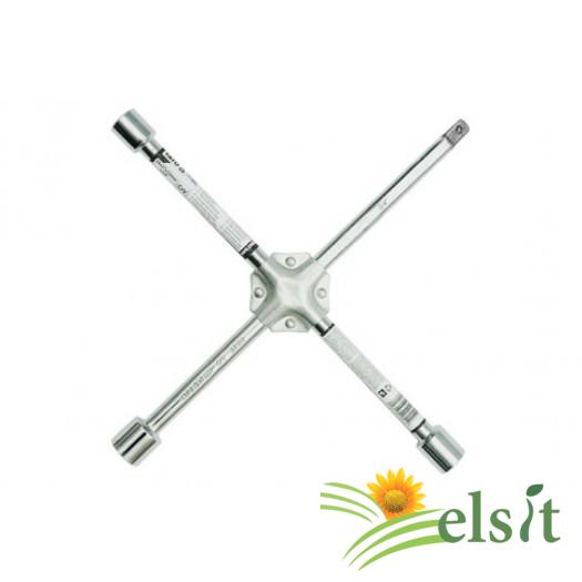 Cheie de roți in cruce, realizata din oțel de înaltă calitate, crom-vanadiu. Are 4 brațe cu tubulare potrivite pentru toate tipurile de șuruburi si prezoane folosite la autoturisme și camioane ușoare. Imbinarea bratelor a fost intarita cu tablă de oțel dublu nituita, crescand siguranța și confortul utilizării.