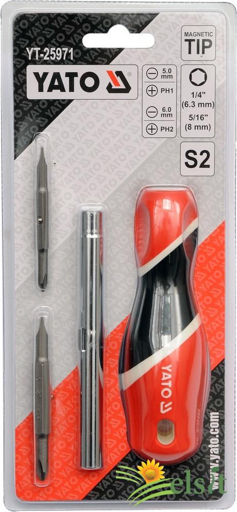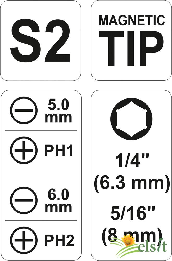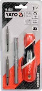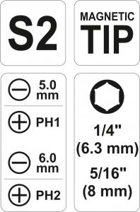 Șurubelniță cu vârfuri interschimbabile. Setul include trei vârfuri cu două capete din cele mai utilizate profile, fabricate din oțel cu simbolul S2.