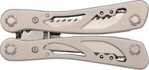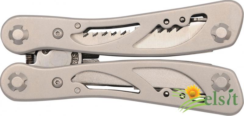 Patentmultifuncțional pentru turiști, pescari, vânători. Fabricat din otel inoxidabil cu simbolul "420" și aluminiu.