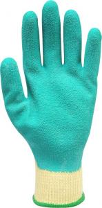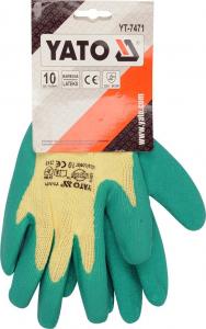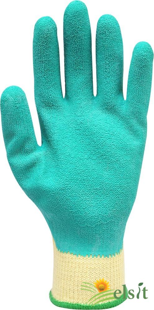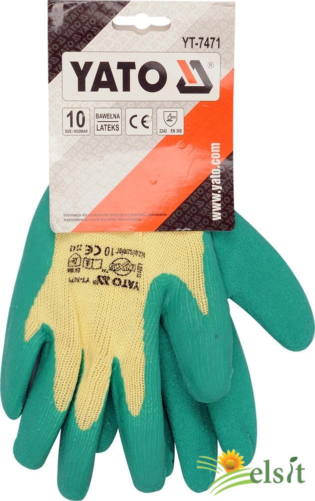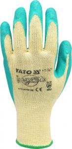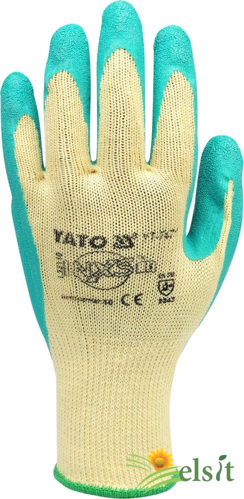 Mănuși de protecție din bumbac cu adaos de poliester, finisate cu manșetă cu nervuri. Palma și degetele sunt acoperite cu un strat de latex gros, flexibil. Dimensiunea 10 ".
